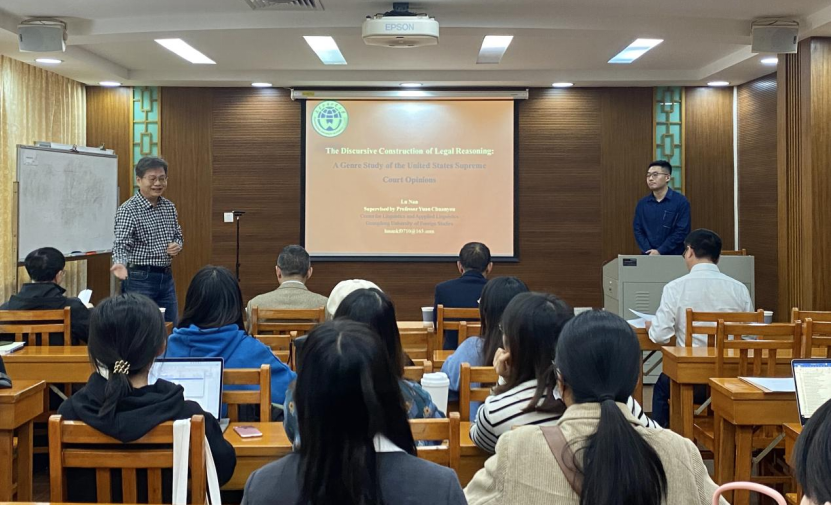 卢楠的博士论文题目是:The Discursive Construction of Legal Reasoning:A Genre Study of the United States Supreme Court Opinions(法律推理的话语建构——美国最高法院司法意见书的语类研究)。答辩伊始,袁传有教授简要介绍了卢楠的基本情况,并且对各位专家评委的到来表示热烈欢迎。随后,卢楠分别阐述了论文的研究对象、研究目的、研究方法、研究发现、研究意义,并对预答辩和外审专家提出的建议做出回应。