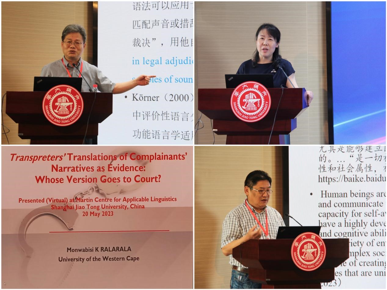20日下午,共有四位专家进行了发言。广东外语外贸大学袁传有教授从法律语言学的新发展谈起,介绍了功能语言学作为法律语言学研究的“新利器”所带来的丰硕成果,并结合具体的法律概念,分析“法制”与“法治”的赋价技术性和增价图标化,揭示从“法制”到“法治”理念的功能语言学进路。来自上海市第三中级人民法院的刘静法官从实际的工作经历出发,对诉调对接中的语言现象进行了介绍。刘静法官以发生在各个阶段的调解实例为语料进行了剖析,并对今后的调解话语研究如何提升调解成功率、调解话语的运作机理及如何指导调解员化解纠纷的能力提出了展望。南非西开普敦大学的Monwabisi Knowledge Ralarala教授分析了原告的口头叙述,结合实例说明译员对原告宣誓陈述的重述和重写(retelling and rewriting)实际上可能对原文本造成一定曲解。上海交通大学的王振华教授将语言看作“人-言-事”一体,在重视语言学意义的基础上,借助适用语言学的理念,讨论人在使用语言时因语言伦理产生的社会意义,以及不符合语言伦理的意义导致的后果。