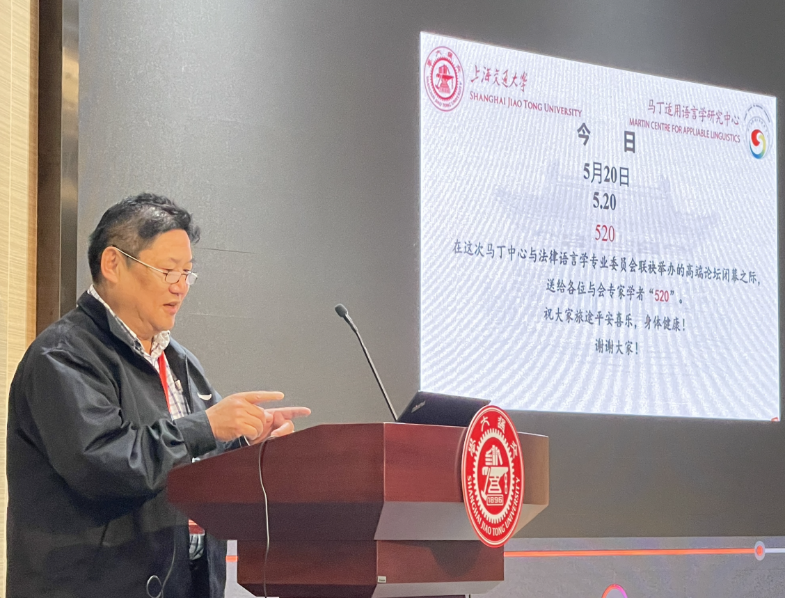 最后,在王品老师的主持下,闭幕式环节首先由广东外语外贸大学袁传有教授进行总结发言,袁教授对马丁中心承办此次会议、提供学术交流平台真诚致谢,并鼓励各位学者持续加强法律语言学研究成果的实践意义,努力为我国的司法实践做出积极贡献。随后,上海交通大学马丁中心主任王振华教授致闭幕辞,王教授感谢各位与会代表对本次论坛的大力支持,并以交大校园里蔷薇园盛开的鲜花向大家致以最美的“520”祝福。