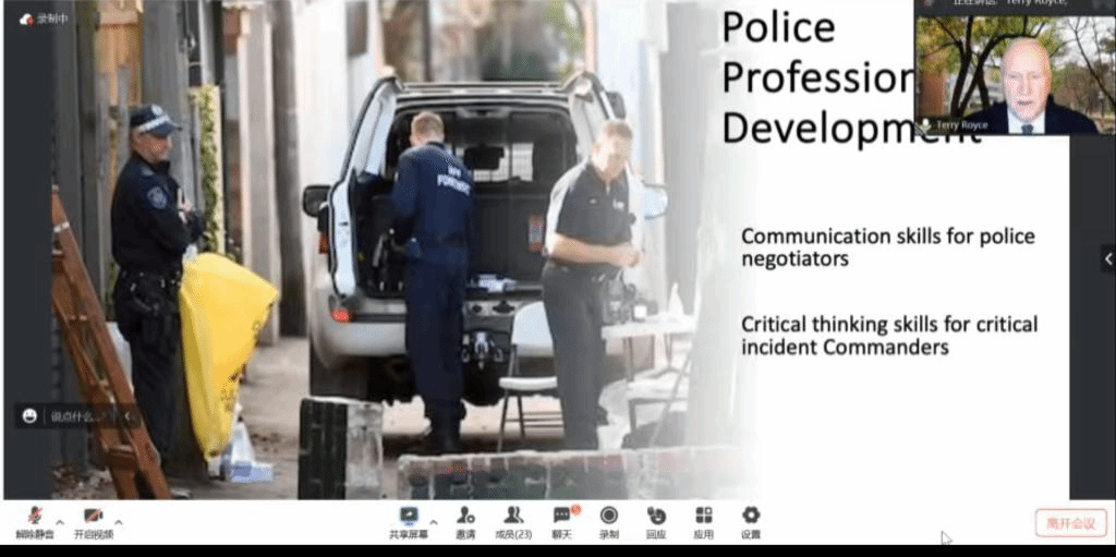 本次讲座围绕警察职业发展必备的沟通技巧与批判性思维,结合具体的案例与研究成果,分享了法律语言学研究成果的应用情况。讲座内容分两部分展开。第一部分讲述了Royce教授与澳大利亚警方的合作研究,重点介绍了警方谈判人员在处理各种危机和绑架事件时需要用到的沟通技巧。第二部分内容重点探讨了重大事件中警方高级指挥官的批判性思维。