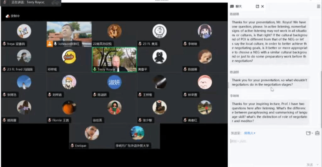 2023年10月19日晚七点,商英学院云山讲座教授、澳大利亚悉尼理工大学Terry Royce教授为法律语言学方向师生带来“法律语言学系列讲座”第一讲。该讲座以线上形式进行,由商务英语学院法律英语系主任张新红老师主持,文科基地袁传有教授、法律英语系张少敏老师以及法律语言学硕士和博士研究生积极参加了本次讲座。