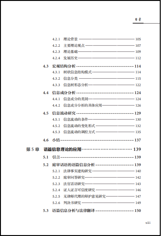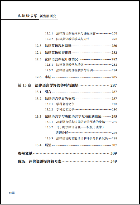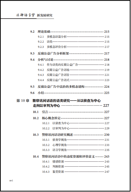 《法律语言学新发展研究》一书对国内外法律语言学领域的最新重大理论和应用成果进行了深入且多维度的探索。全书分为上、中、下三编。上编(绪论、第1、2章)详细回顾了法律语言学在国际和国内的历史发展轨迹,重点介绍了各个发展阶段的核心人物及其代表作,并对国际与国内法律语言学的研究内容、主要研究机构、学术会议和学术期刊进行了系统的整理。中编(第3至第5章)主要阐述法律语言学的相关理论和方法论。其中,第3章主要介绍了法律语言学所使用的“语言学工具包”,并探讨了多视角法律语言学研究;第4章和第5章则重点阐述了在我国本土发展的法律语篇信息理论,以及其在庭审话语分析、法律翻译、法律语言教学以及语音识别等不同领域的应用研究。下编(第6至13章)专注于法律语言学的应用研究领域。第6章至第10章从系统功能语言学的角度探讨法律语言学在司法、执法、普法方面的专题应用(也称为功能法律语言学研究):第6章主要对中英判决书的语类结构和评价资源的使用特点进行对比分析;第7章运用合法化语码理论来分析美国司法意见书中语法隐喻的语义功能;第8章研究中国社区矫正话语,探讨司法社工在社区矫正对话中的身份建构问题;第9章聚焦法治和反腐领域,研究多模态普法话语;第10章描述了从以侦查为中心到以审判为中心的两种讯问模式的语言特征和评价策略。第11章关注法律语言学的本体研究,介绍了语言犯罪和文本证据研究,包括网络语言犯罪中的文本作者识别、文本作者画像、语言学证据与专家证人等新兴的法律语言学应用研究。第12章关注法律语言的教学与培训,从课程设计、教材编写和师资建设等方面介绍了国内外法律语言教学的现状。第13章描述了国际和国内法律语言学界的争议,并且展望法律语言学的未来发展趋势。