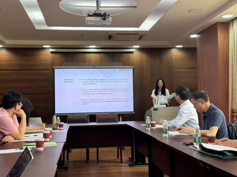 首先,在论文展示环节。曹慧姝围绕美国刑事庭审中控辩律师结辩陈词的多模态叙事对抗展开汇报。研究以五个警察暴力执法案件的庭审语料为基础,融合系统功能语言学与后经典叙事学理论框架,采用语料库辅助的社会符号学分析方法,借助UAM CorpusTool、ELAN和Praat等多模态标注工具,深入解析语言与副语言符号在叙事对抗中的协同机制。论文创新性地构建“微观符号资源-中观情景语境-宏观社会文化”三维分析模型,揭示叙事对抗本质上是多模态符号实践、情境协商与社会文化意识形态互构的动态过程,为理解美国对抗式司法体系中“法律真相”的社会建构提供了全新视角。